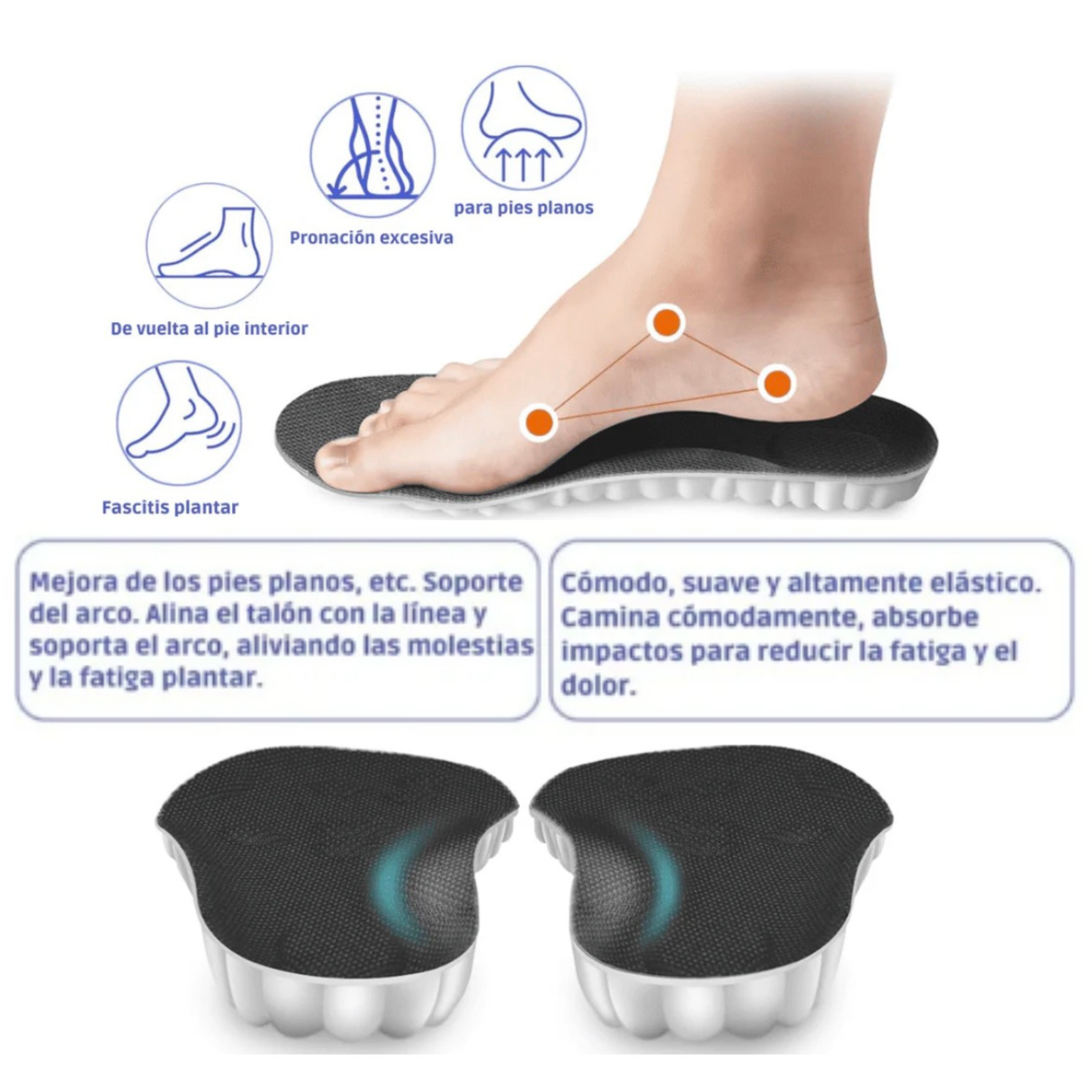 Reducción del dolor en el pie: El soporte y la amortiguación del arco ayudan significativamente al dolor del pie.